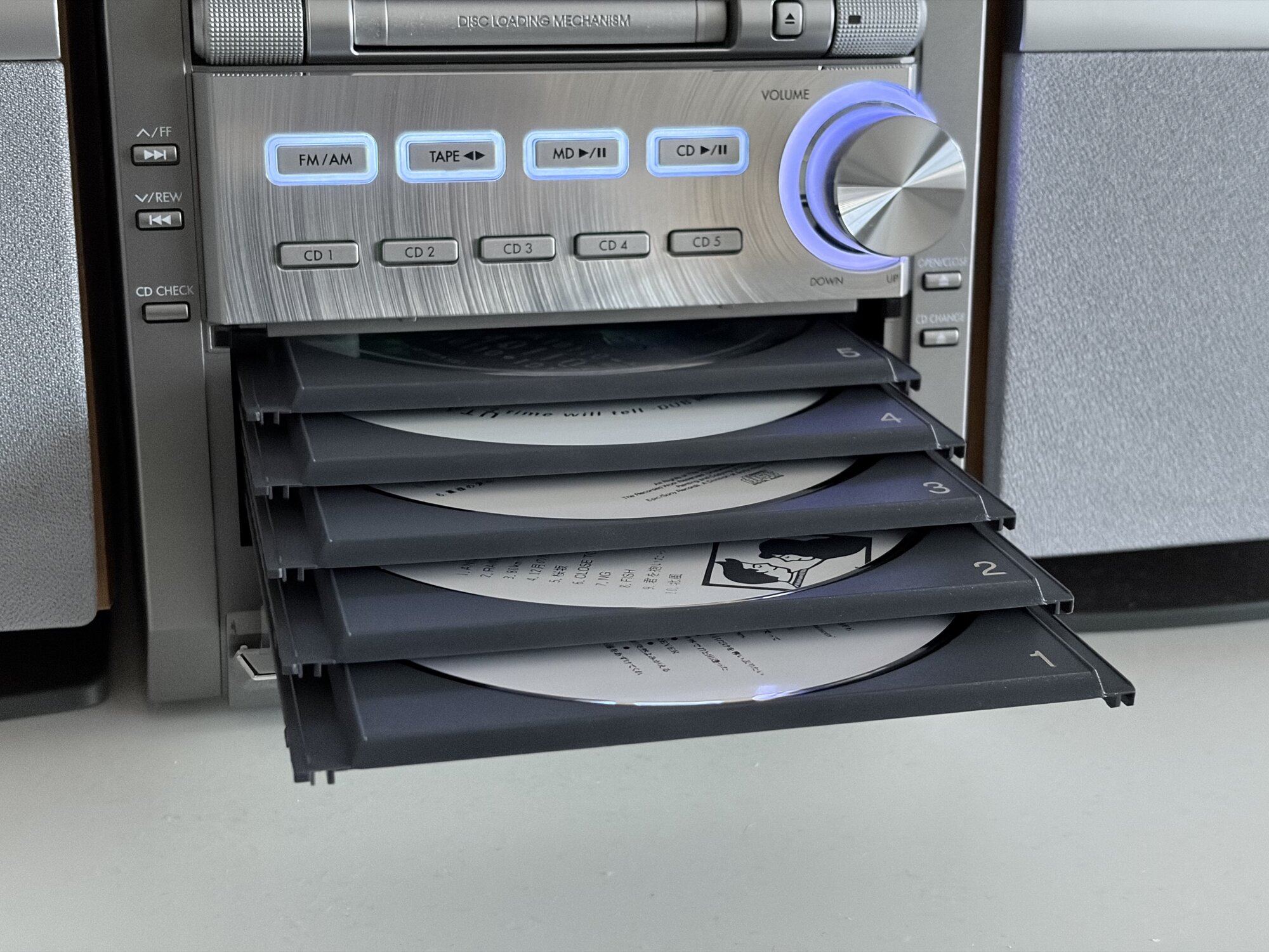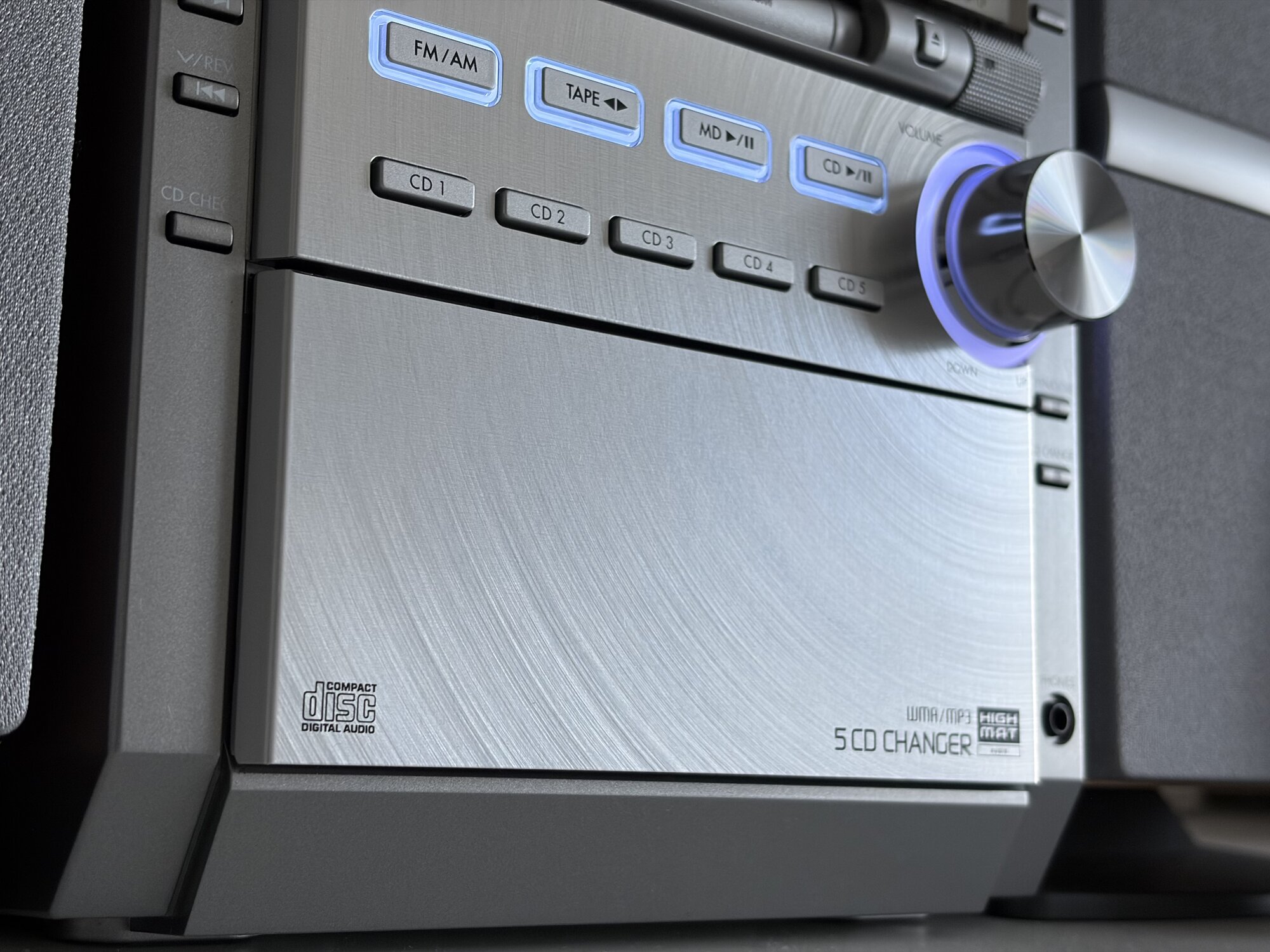 So, it's built well, has plenty of features, and looks great... but what is the user experience like? Thankfully, using it is easy and simple with no confusion. The 4 main glowing buttons on the front panel are the 4 'play buttons'. Having a separate play button for each mode (CD, TAPE, MD, AM/FM), instead of just one play button is a great way of combining a function selector and a play button into one action, and you don't have to play guessing games at what the play button is going to do in a given scenario. It's also nice that the volume dial glows, I think it kind of separates the most important high level functions from the rest.