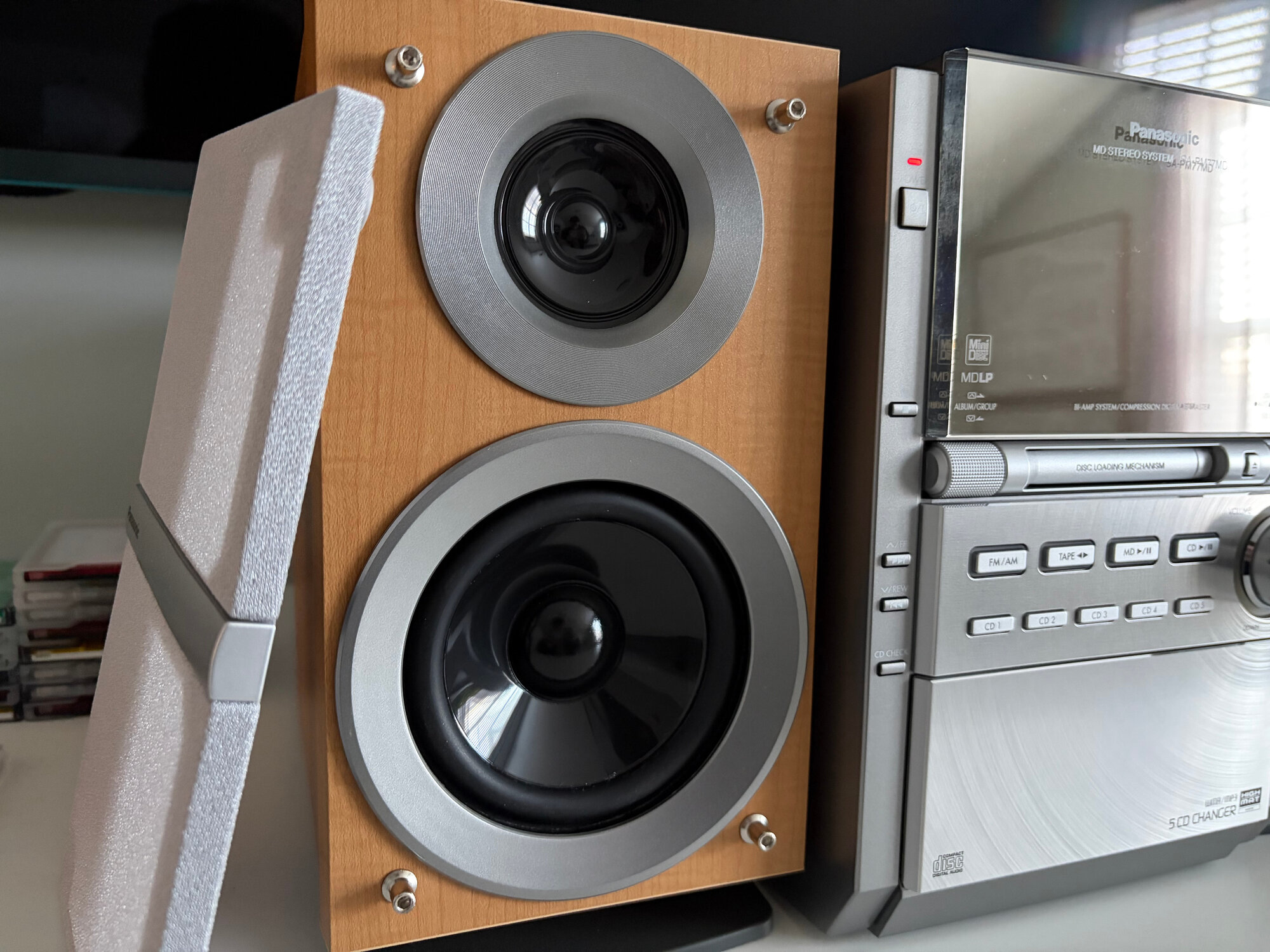 So now for the build quality. Starting on the inside, I was quite surprised how well-built the entire machine is. The tape mechanism has a proper flywheel and electro-magnetic erase head, plus the CD changer mechanism is fairly heavy and well-engineered. Everything on the cassette side is also full logic controlled, which was hard to find in 2003. On the circuitry side of things, Panasonic decided to use quite a few of the Nichicon Gold Class capacitors throughout this unit (even on the power stage). There are also plenty of the Nichicon red and green caps to be seen as well. Finally, I found plenty of heatsinks on transistors and audio components that get hot which is great for longevity. This thing was clearly built to last. The build quality on the outside is also fantastic as well. The speakers while being that classic early 2000s vinyl wrapped MDF are still very high quality, and having two speakers per box with separate wire and amp drives is a major win for sound quality (more on that further down). The sturdy metal posts on each speaker box combined with the rubber grommets on the speaker covers means that even at high volumes, the speakers will not rattle. I also love the beautiful circular brushed aluminum plate on the CD changer lid, as well as the mirrored plexiglass screen that makes the display text blend in to the mirrored finish and the display panel itself nearly invisible to the naked eye. It is all so carefully considered, and for a simple mini system (especially one from the early 2000s), it appears bespoke, intentional, and as something undeniably high end.