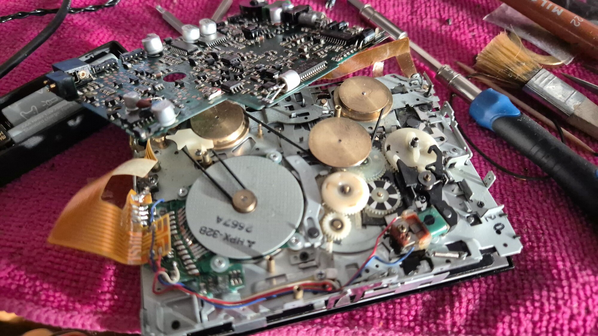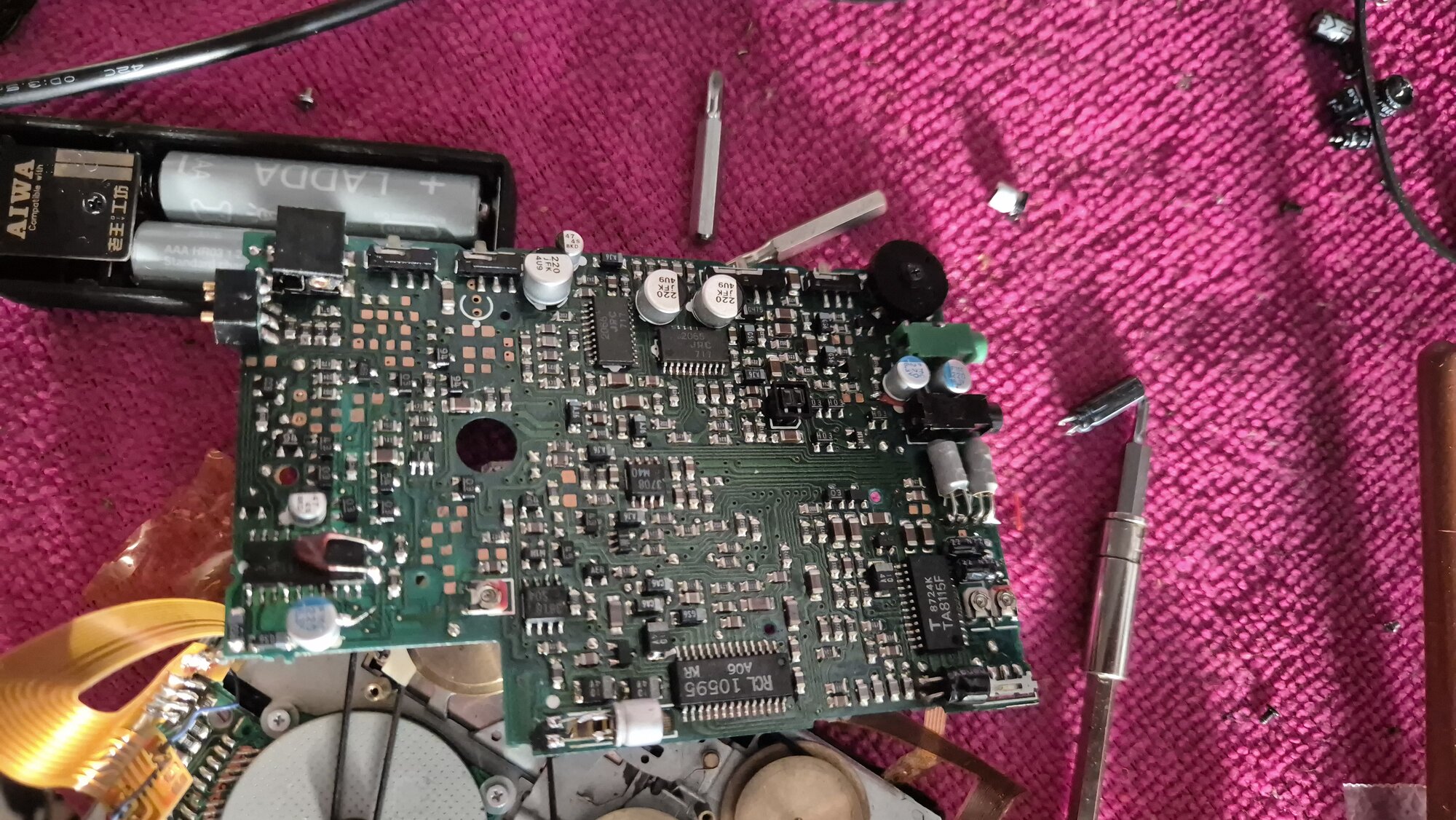 I got some beat up unit of aiwa px10 (same as 101 and px700) it was untested and i haven’t had any power source to test it at first. Meanwhile when i waited for battery case i swapped to new belt. This unit was never opened before had a paper stickers on pcb. When i received pack i finally tested and appears that red light, light up for a second and than fades away. I thought maybe i should recap whole unit i managed to replace almost every cap except these 2 47uf on right side of remote jack plug. Now the unit works and rotate cassette in ffw and rev mode but when it plays there is a huge problem. It plays for a second in high speed and than stops. I have no idea why it works that way so i'm thinking maybe somebody can help me with it. https://imgur.com/TknZrEj