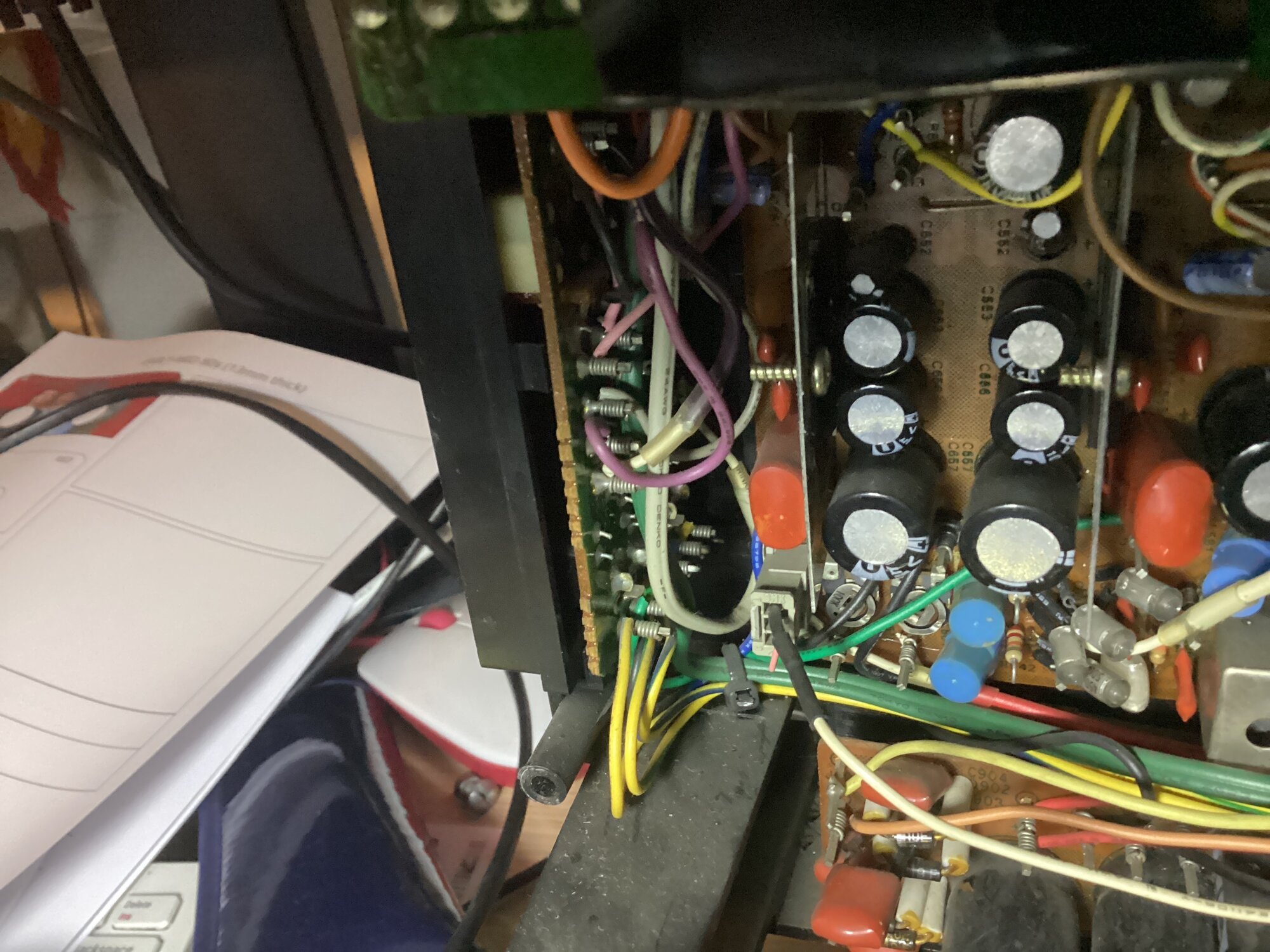 When dismantling upper panel from the front, take care of this hidden screw, wich is operated from the back of the chassis,trough a hole upside the main board.