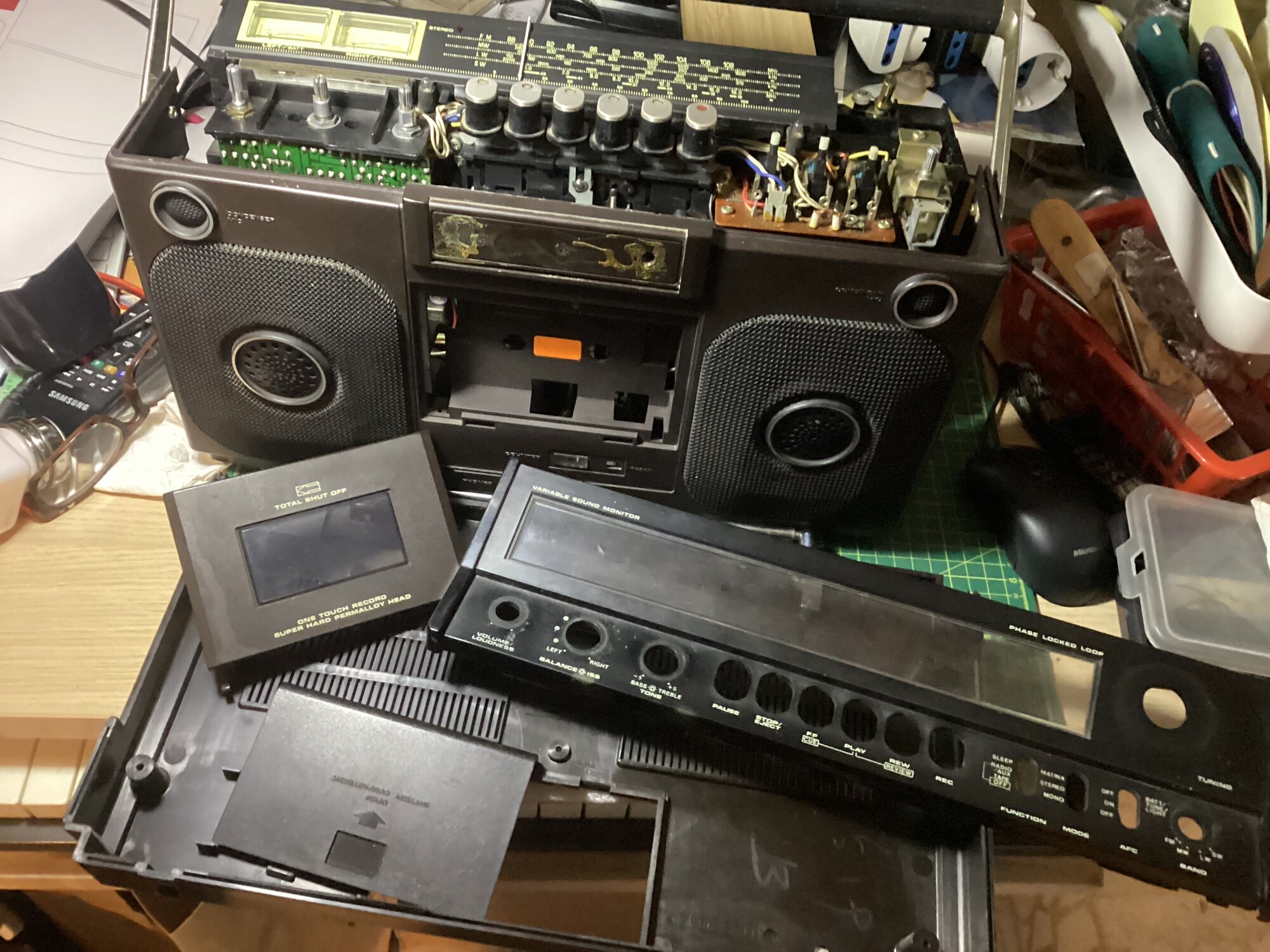 I'm positively impressed by general qualities built in this 50 years old boombox: no broken plastics, chassis, electronics, and even the belts, despite ageing, are still working.