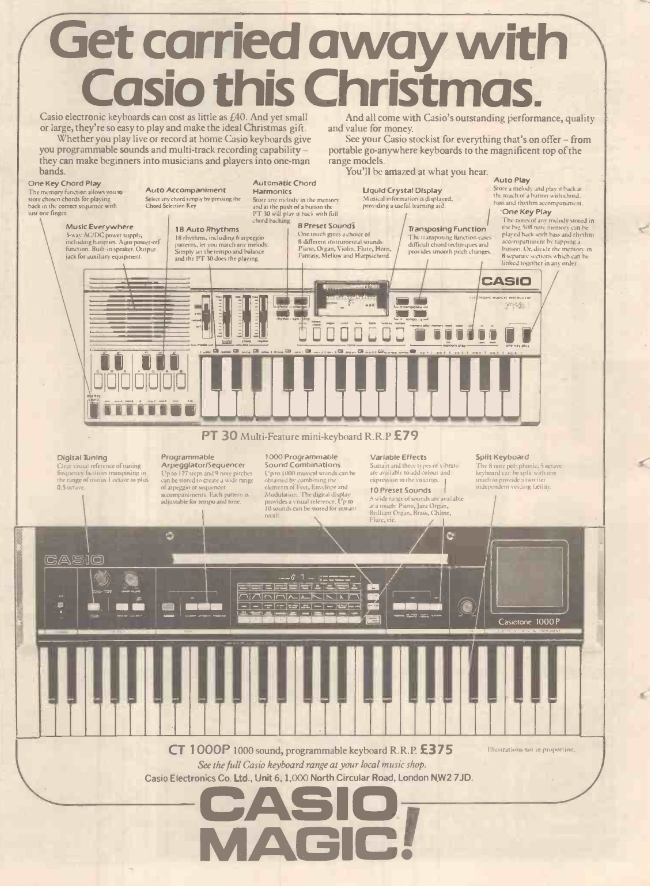 Notice "See the full Casio range at your local music shop". That was actually correct in 1983 when I bought my MT65. The shop I bought it in specialised in home organs of the teak finished console variety which cost over £1000 but didn't sound any better than a top of the range Casio. It would be another couple of years before Casios and Yamaha keyboards started appearing in electrical shops