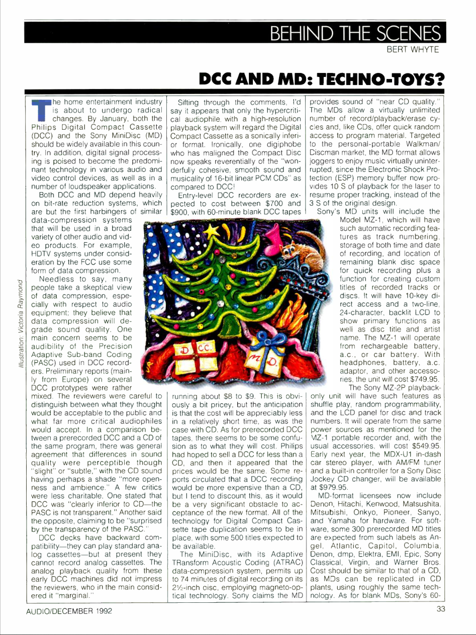 DCC And MD: Techno-Toys? Audio Magazine from December 1992. DCC in the US seemed mired in litigation, Sony bought a movie and music studio to get a seat "with the other side" which seemed to help get MD to market easier. Both of these formats were very expensive and CD players were just starting to drop in price.