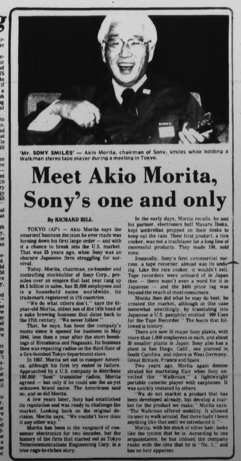 Interesting language in the article. The Japanese Akio Morita set out to conquer America a decade after the American nuclear bombing of Hiroshima and Nagasaki and firebombing of Tokyo. Soft power instead of hard power. The same as China does now. I don't know about electronics, but the Japanese government used to subsidize Japanese car sales in the U.S.