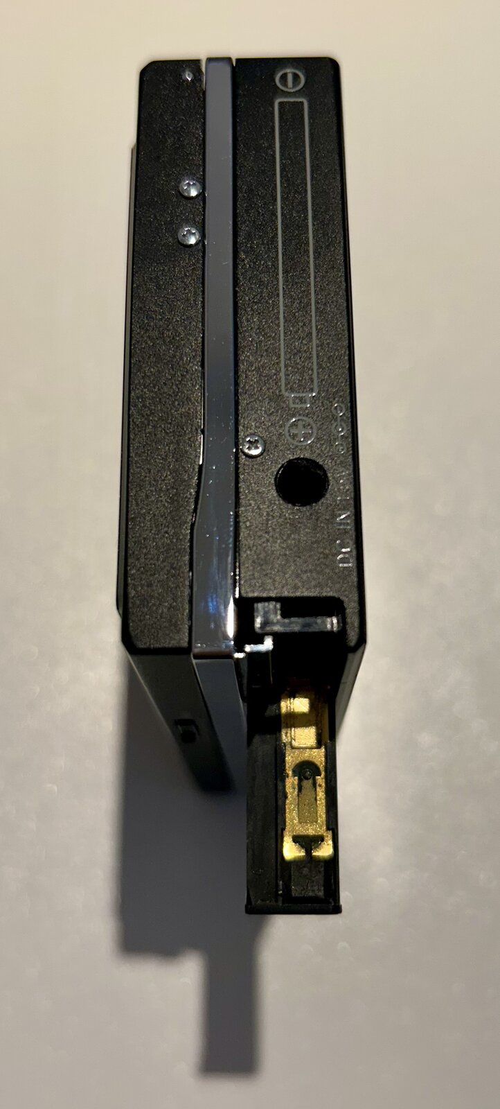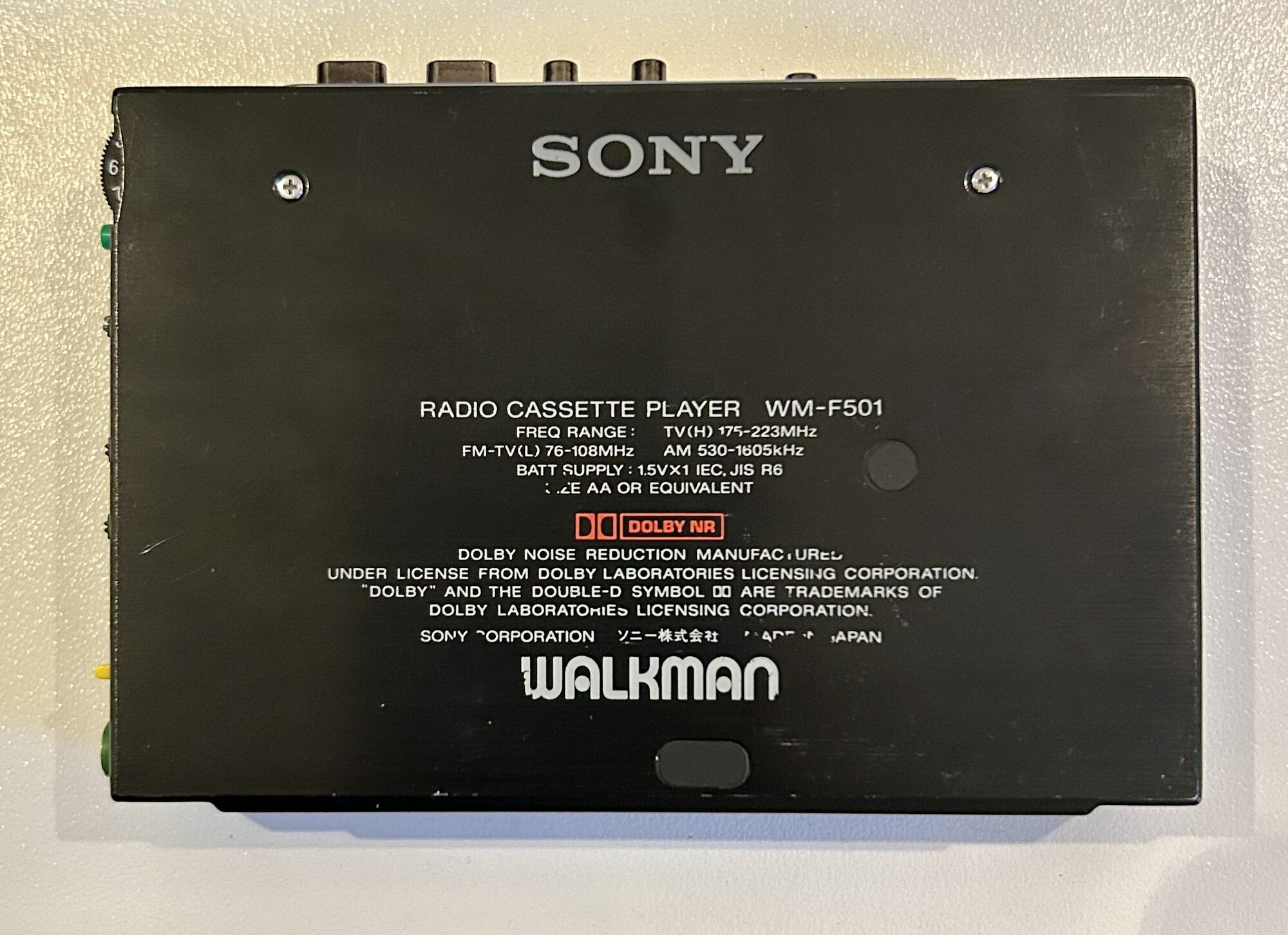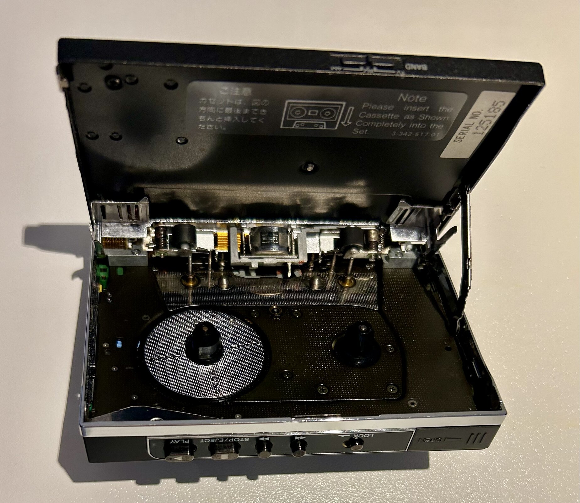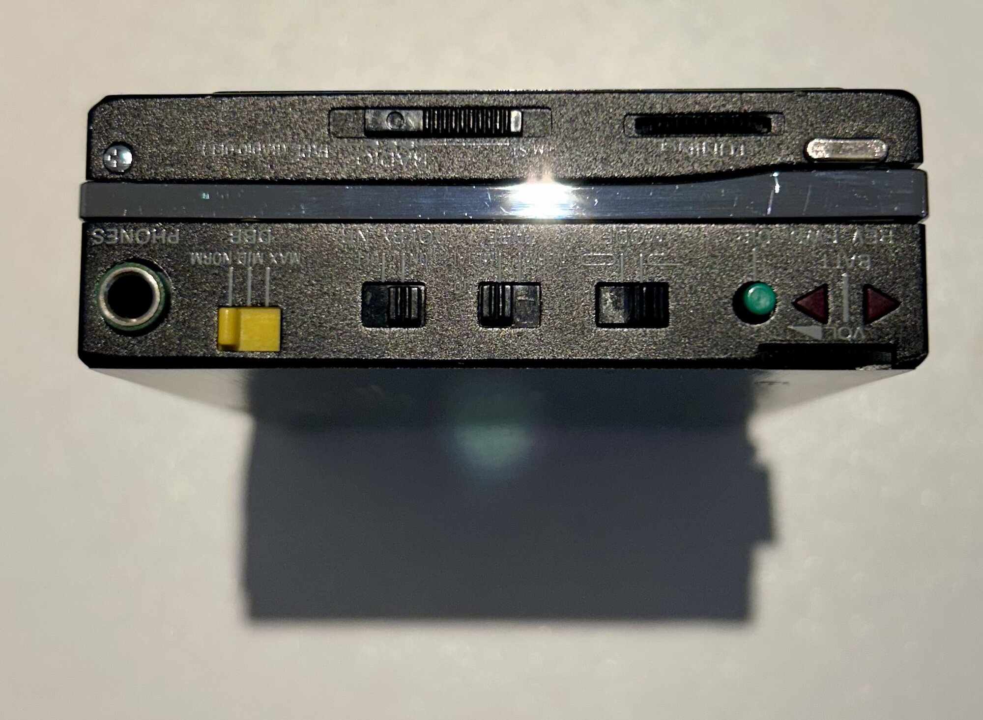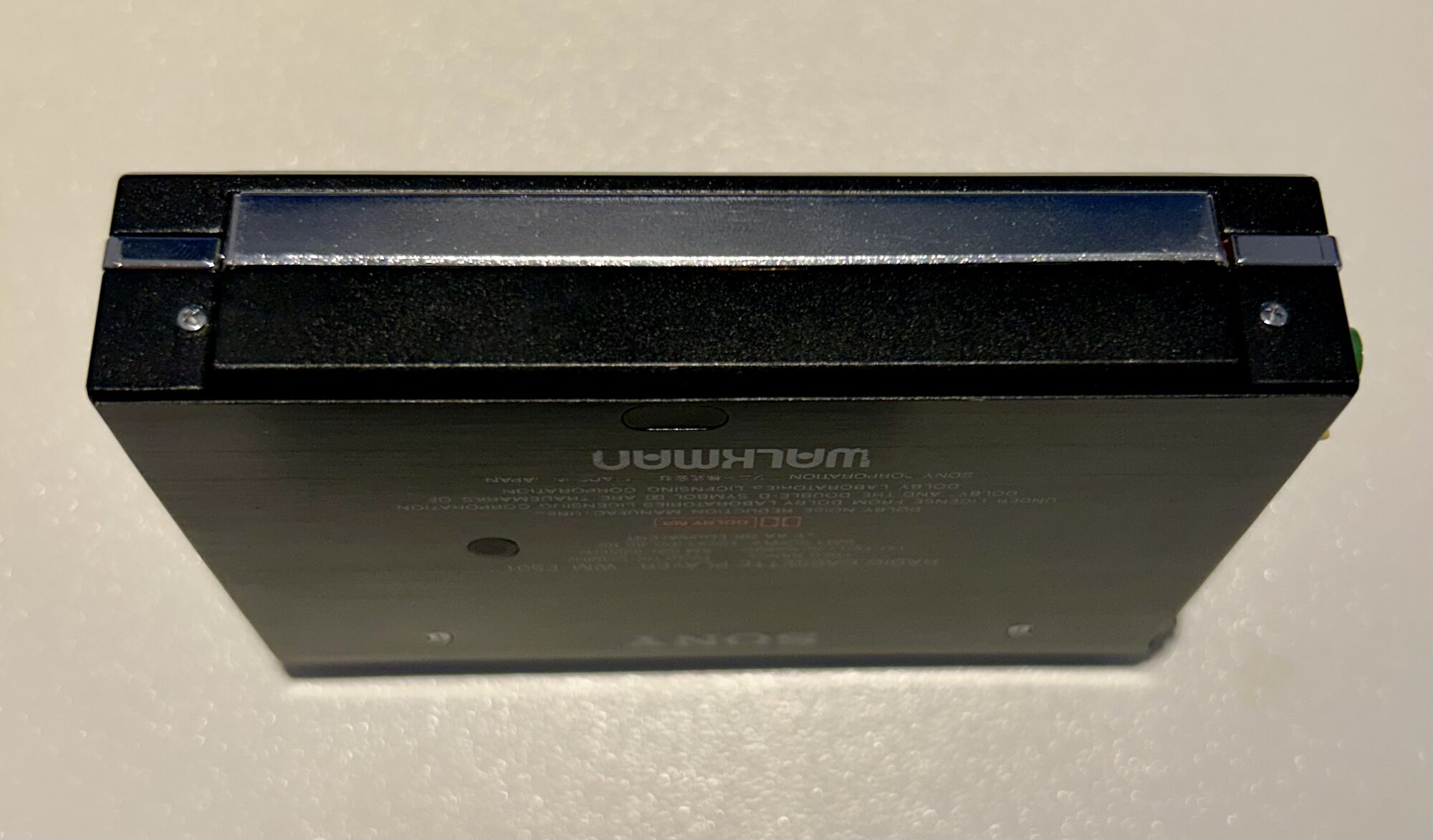 I will be offering my unrestored WM-501 with original case, and adapter gumstick (no battery, just to accept an mains adapter) soon here too. I don't have detailed pictures at the moment, send a private message when interested. A very nice looking WM-F501 has been waiting for a service / repair. Currently the cassette part is currently not working, while the radio is working. See the pictures below, from every angle, rollers, capstans, and head, for the condition. No visible corrosion in the battery compartment or rust on the capstans. I cannot detect a crack in the large gear. Upon request and with a fair offer, I will send a video with audio of the radio, working while the unit is powered by a gumstick, connected to external speakers. Volume and tuning operations are without crackles.